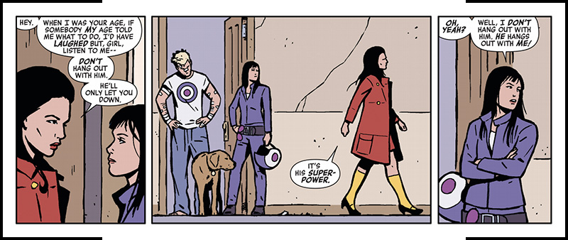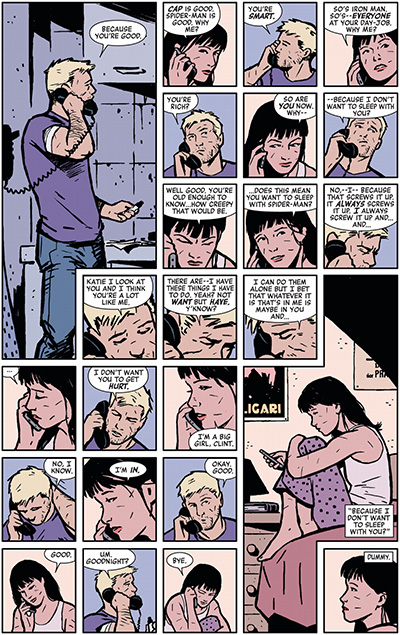 It’s easy to see why Clint would be interested in forging this bond: as written by Fraction, Kate’s got this spunky much-younger-sister energy that is very winning, and she’s a prodigy in their shared area of expertise, but like Clint says, in a line borrowed by the TV show, she’s like nine years old and he actually has a lot of valuable instruction to offer her. But that instruction does not include what those of Kate’s generation call “adulting”. On that continuum I mentioned above, Fraction’s Clint is at the “impulsive dumbass” end of the spectrum. He’s a fuckup without much in the way of emotional intelligence, who makes thoughtless decisions that drive people away. Here’s a piece of a sequence that has stuck with me since 2013, in which Clint’s “friend girl” cuts him loose after discovering that he’s cheated on her—and the response from Katie‑Kate, as only Clint gets to call her, sums up their dynamic very nicely: |
