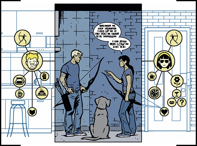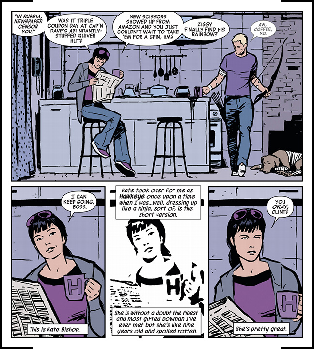 There’s quite a contrast between the “widescreen comics” style of The Ultimates, with its giant panels and intricate digital coloring, and what we see above: a flat, restricted palette, with poses and body proportions that do not adhere to the rules set forth in How to Draw Comics the Marvel Way. But turning to content—as you have probably gathered from the samples above, this book is about Clint and Kate. While I’d say that Hawkeye v4 was a landmark first for its formal experimentation and probably second for its sensibility—the humor, the cadences of the dialogue, the creators’ sense of what’s cool—third place, and probably more like place 2B, goes to the character work. Fraction has Clint and Kate partner up in a mentor/protégée relationship that forms the emotional core of the book: |