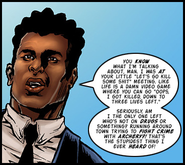 I guess the character note that is new here, or at least new to me, is that this is a Clint Barton who seems like he’s been beaten down by life. The Clint I grew up with tended to bounce back and forth between sanguine and choleric, while this one is more phlegmatic and melancholy. He rarely makes for great company in this series, but of course Kate doesn’t spend so much time at Clint’s place just to shoot the breeze. She’s there to learn how to be a superhero without powers. As the TV show says, Hawkeye is in some ways the most impressive of the Avengers, as he takes on the same threats as Thor and Captain Marvel and the other heavy hitters, only he does it with no super-soldier serum, no fancy tech, just “a stick and a string” (another phrase borrowed from Hawkeye v4). But this goes to show what Hawkeye’s real superpower is: plot armor. As a character in my own webcomic says: ![]() It’s easy to see where the idea for Hawkeye came from. Archers shaped the history of warfare for millennia. It stands to reason that the archetype would still be kicking around in the culture even as they’ve been obsolete on the battlefield since the sixteenth century. But it doesn’t actually work. One of the running themes in Hawkeye v4 is that, having no healing factor but nevertheless constantly jumping out of skyscraper windows or getting into car crashes, Clint gets injured a lot. Fraction and Aja’s version of Hawkeye is sporting a hundred bandages on any given day. It looks like he must spend half his Avengers salary on Neosporin. But I would argue that leaning into realism this way is the wrong play for this character. Drawing attention to Clint’s injuries just encourages readers to continue that line of thinking. The book concedes that, if each adventure means Hawkeye is rolling a die to see how much damage he’ll take, he racks up a lot of fours (“My concussions have concussions,” he laments) and even some fives (he starts Hawkeye v4 #1 with a shattered pelvis). But that just makes it seem that much more unlikely that Hawkeye could make it through adventure after adventure without even once rolling a six and winding up not in traction but in the morgue. Bringing a bow and arrow into a fight against a random goon with a gun, let alone against Ultron or Thanos, is cruising for quite a bit more than a bruising. Even with the damage we see him take, how long would it be before the prospect of jumping into action against Count Nefaria was a non-starter? Pro athletes will tear a knee ligament and that’s the end of their careers—but apparently Clint Barton can go through worse on a Tuesday and still be ready to storm a HYDRA base that Thursday. Hell, he gets knocked out by blows to the head so many times that, if we were really going for realism, he’d probably kill himself due to chronic traumatic encephalopathy by issue ten. And Millar’s stab at realism is no better. “Some kid who ran off to join the circus couldn’t really hang with the Avengers! He should be, like, some kind of psycho elite special forces assassin!” That just highlights the fact that actual elite special forces assassins don’t fight terrorists with archery. The better play, I would argue, is to recognize that as much as you might prefer to be writing about an elite special forces assassin, if you get assigned to write a Hawkeye story, you are actually writing a character rooted in the Silver Age of comics whose gimmick is trick arrows. That doesn’t mean you have to camp it up. Take the story seriously on its level. But as a member of the audience, if I start into a Hawkeye story, I don’t want a lot of grim black ops shit. I want putty arrows! Sonic arrows! Boomerang arrows! And I was pleasantly surprised to find that, after several movies with a Hawkeye that drew way too much from the Millar “I wish I were writing Jack Bauer” version, the creators on the TV series realized they were writing Hawkeye. I said that the action sequences in Eternals were “much more relevant to my interests than the car chases […] of Shang-Chi”, and they were, but the Hawkeye TV series has a car chase that I was astonished to find myself really enjoying—it’s even better than the one it was based on, from Hawkeye v4 #3, because in the comic version Kate is driving, while in the TV version Clint is driving and Kate is the one hanging out the window shooting trick arrows at the baddies. She’s never used Clint’s quiver before and so she discovers what each arrow does at the same time we do. It’s super fun. And it’s not just a one-off—the trick arrows return in the finale. That sequence isn’t quite as good as the car chase, but it’s the right sort of action for a Hawkeye story and the right tone, so all in all I’d call it a win. But I guess I’ve sort of buried the lede there. The TV Hawkeye series introduces Kate Bishop to the MCU. She’s the lead; Clint Barton is more of a 1B. And like Clint says in the caption box I posted above, she’s pretty great. MCU Kate is pretty much the same character from the comics, though this is an origin story, so she doesn’t even have the couple of years of experience that Hawkeye v4 Kate does—MCU Kate is starting from scratch, so her reactions to the events around her come with slightly wider eyes. A few changes have been made to her backstory: in the MCU, it’s her father who dies and her mother with whom she has a fraught relationship, rather than the other way around. She doesn’t seem to have a sister. And since the MCU operates in something close to real time, MCU Kate is explicitly inspired as a child by seeing Hawkeye fight the alien horde circa 2012—that battle, from the first Avengers movie, took place in the skies over New York, and as a rich kid growing up in a penthouse apartment, that’s where Kate lives. Cut to her college years, when she sneaks into an underground auction and discovers that the items up for bid include Ronin’